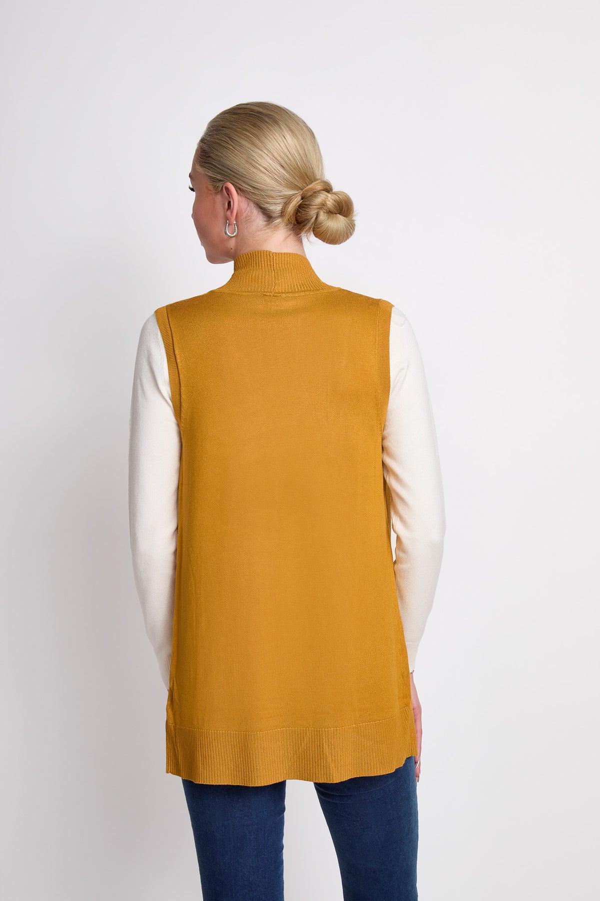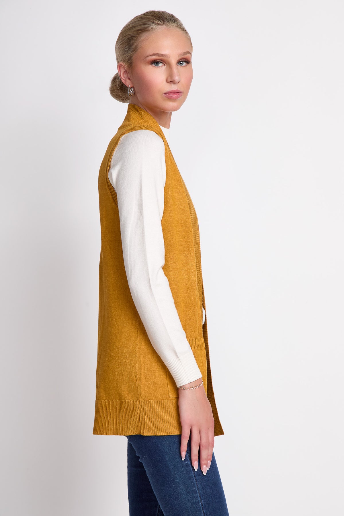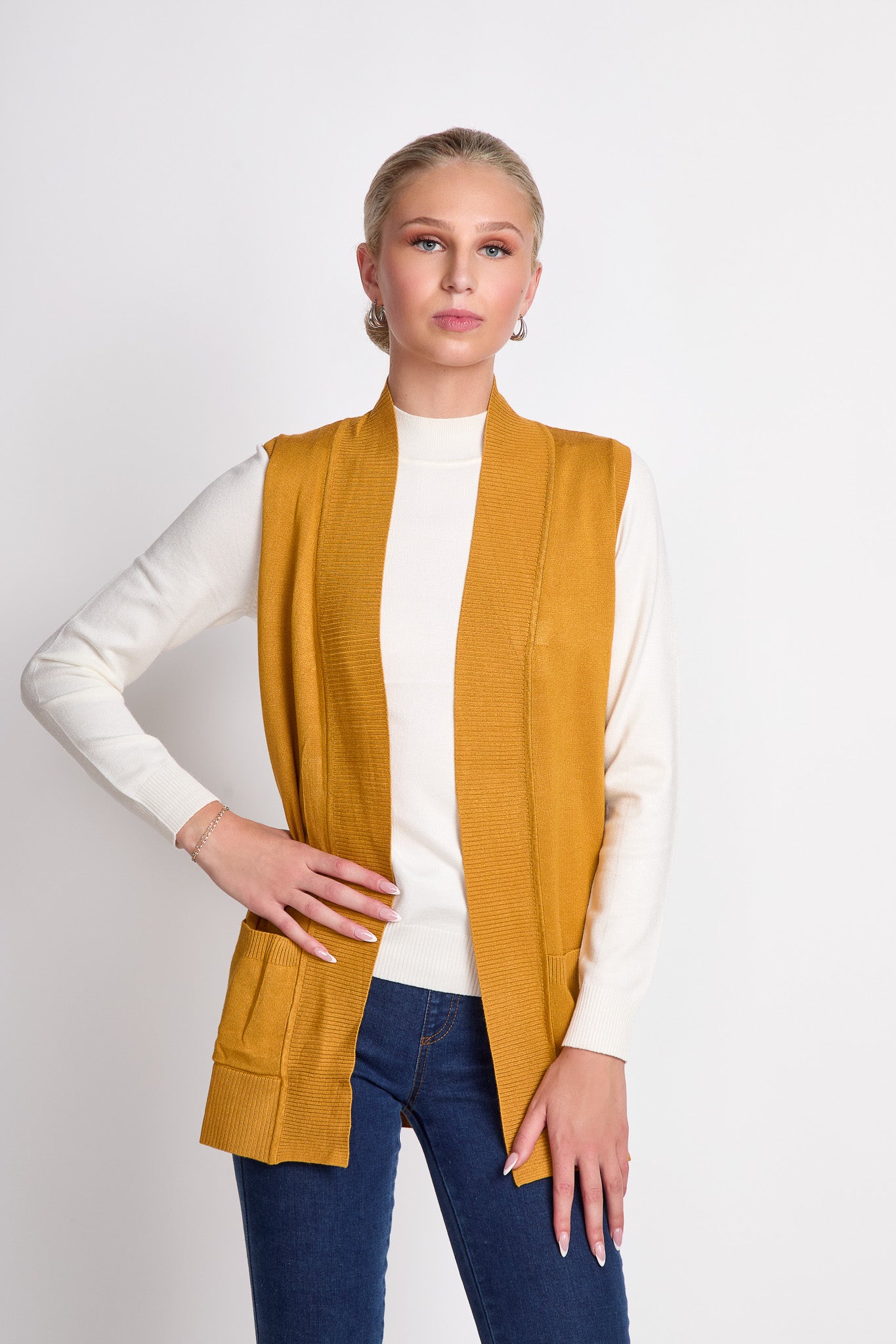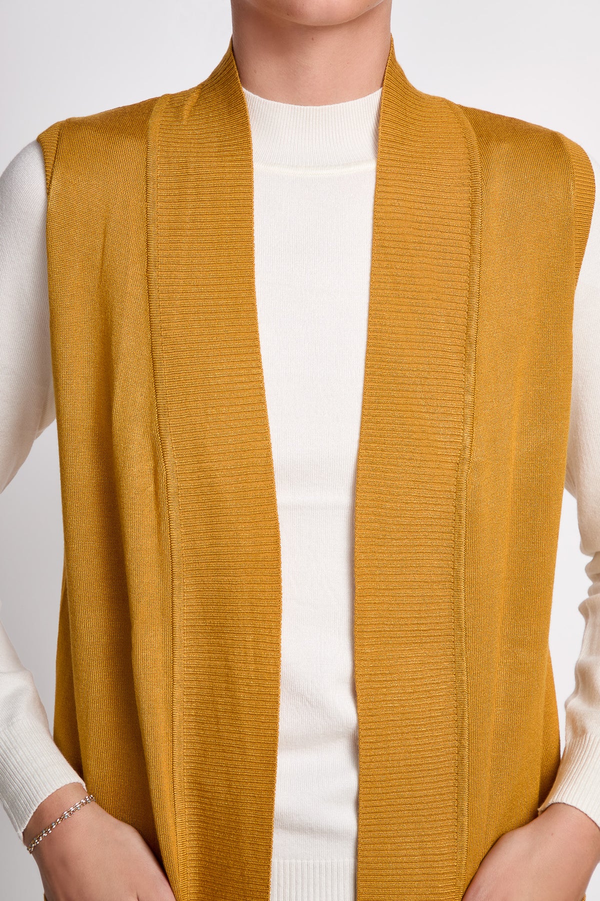 El chaleco confeccionado en un punto fino, su silueta alargada y abierta crea una línea vertical que estiliza la figura al instante. El cuello chal, con una textura acanalada, aporta un detalle de lujo sutil y enmarca bellamente cualquier prenda que se lleve debajo.