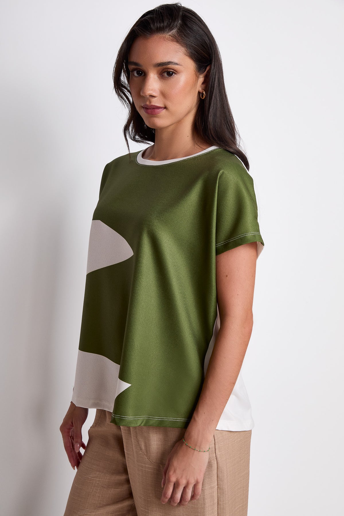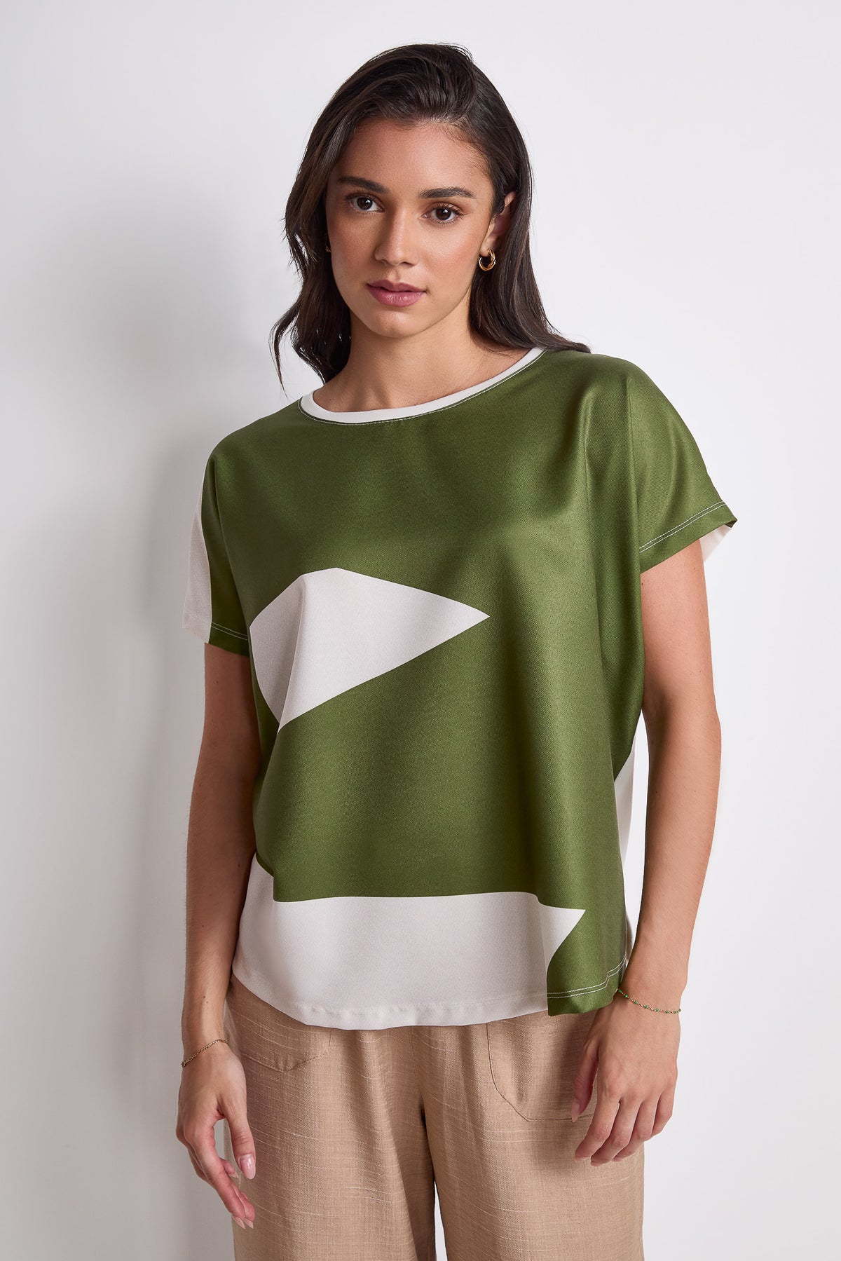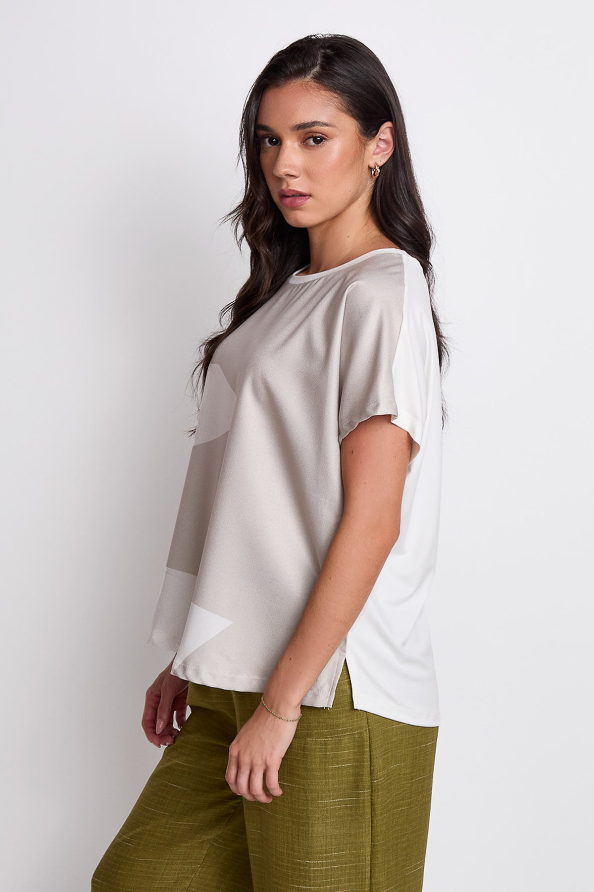 El tejido ligero confiere a la blusa un acabado suave y fluido, realzando su silueta relajada. El diseño geométrico en contraste aporta un toque contemporáneo, mientras que el corte recto y el dobladillo suelto garantizan versatilidad para el día y la noche.