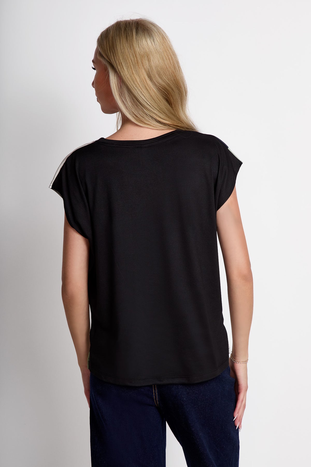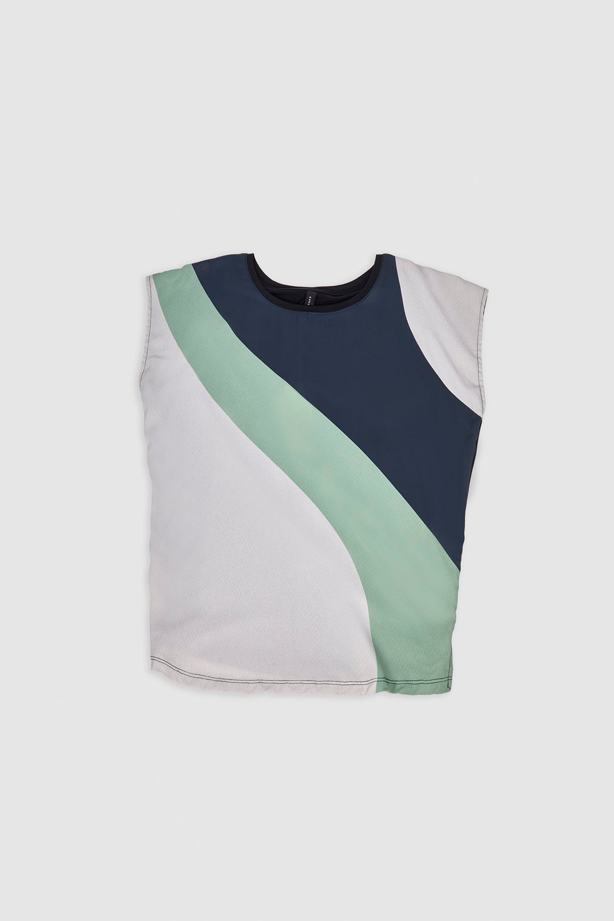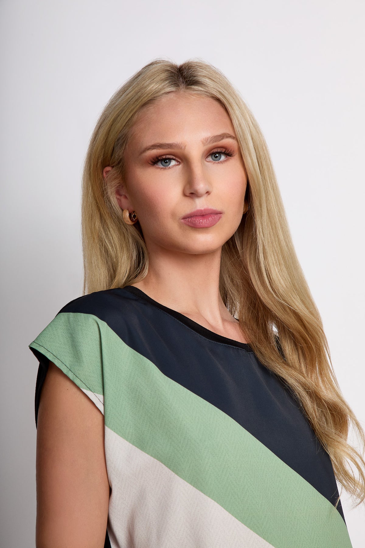 Blusa de viscosa ligera con bloques diagonales en negro, verde y crema que estilizan la silueta. Su caída fluida y corte relajado aportan comodidad y modernidad, en una pieza que equilibra color, movimiento y sofisticación natural.