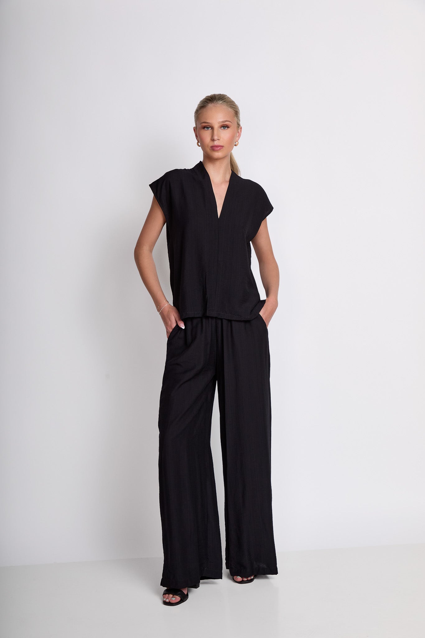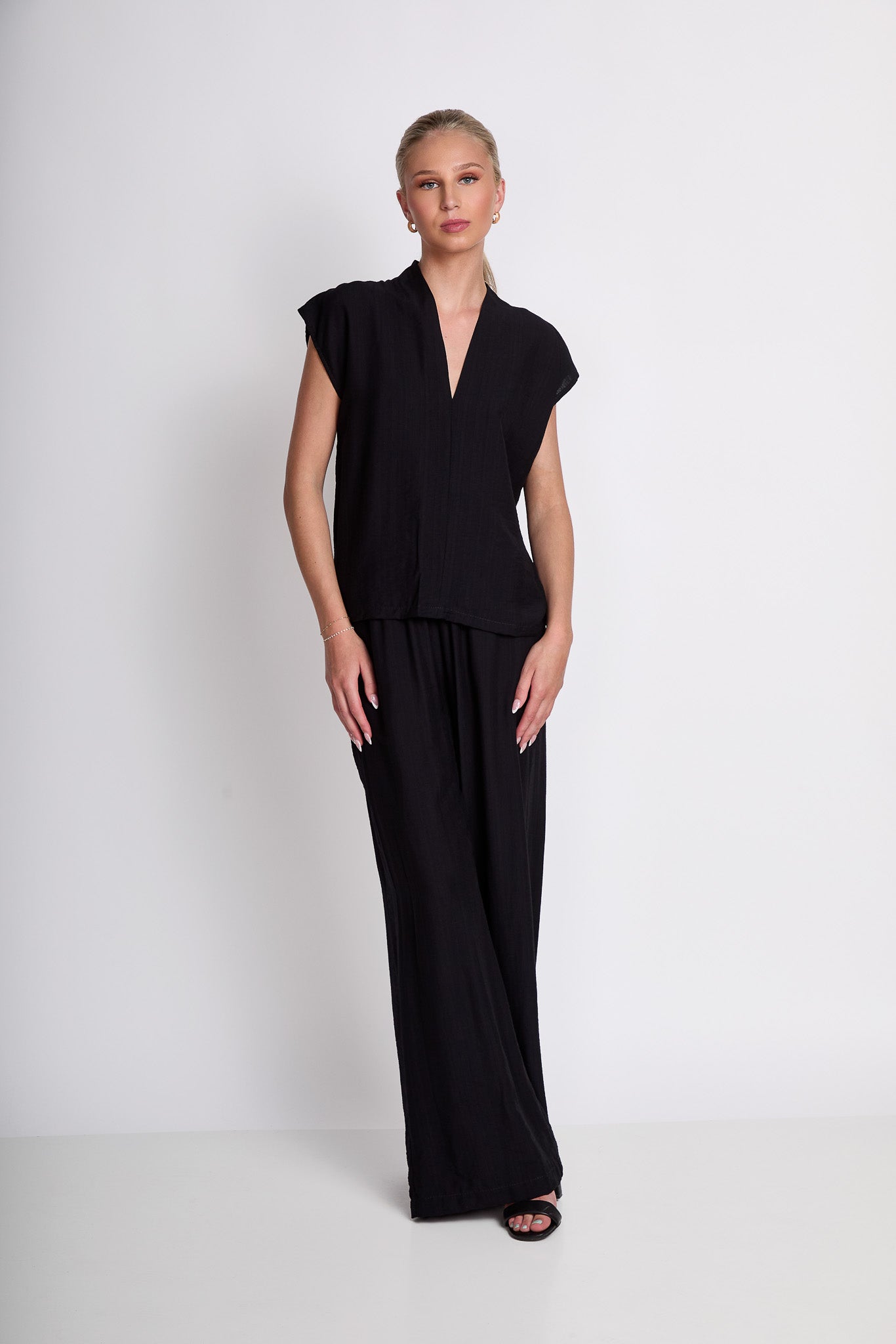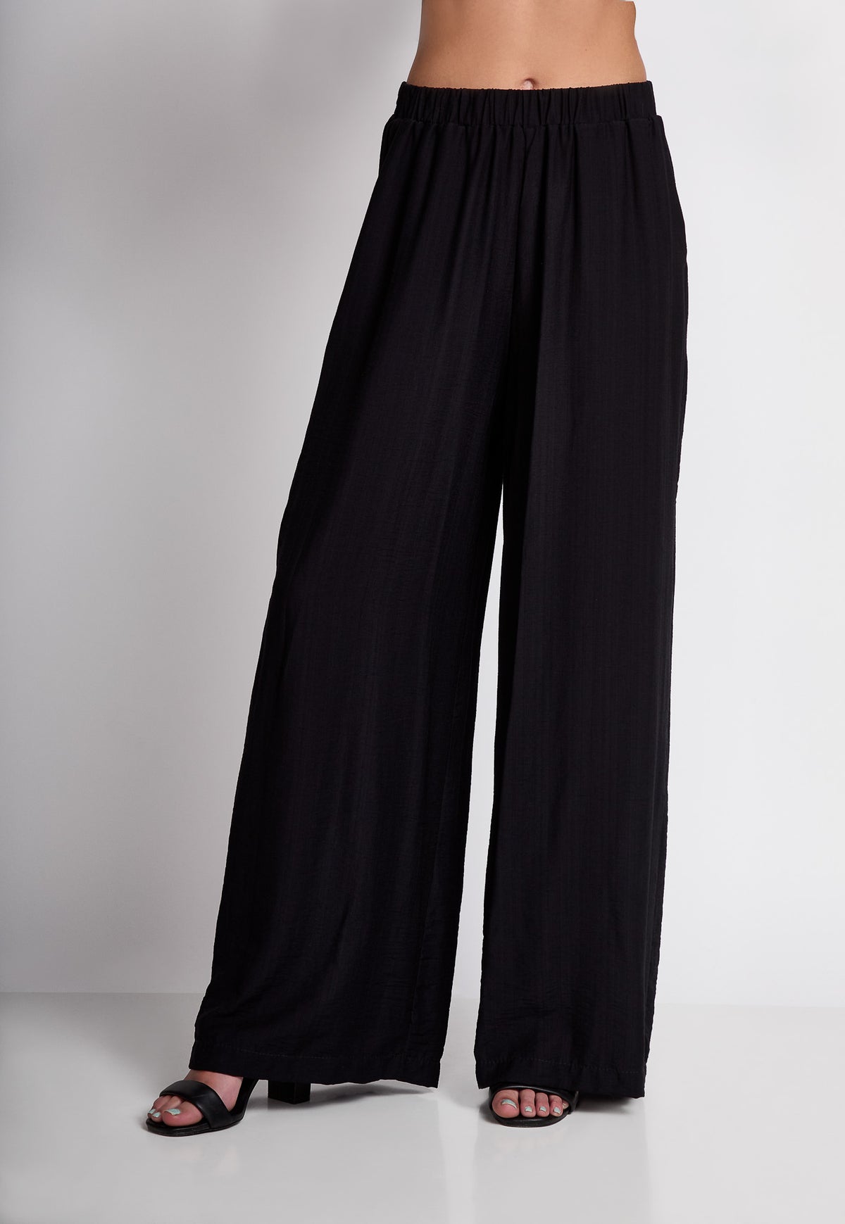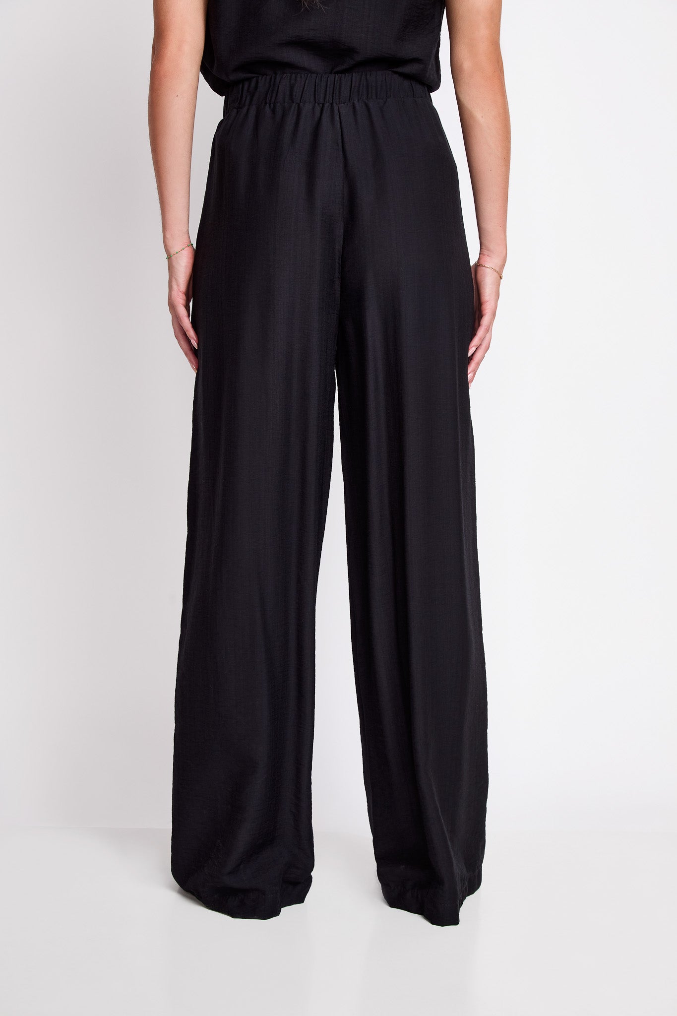 Pantalón amplio de complexión  ligera con cintura elástica que ofrece ajuste cómodo y caída fluida. Su silueta suelta aporta movimiento y elegancia relajada, ideal para un estilo versátil y contemporáneo.