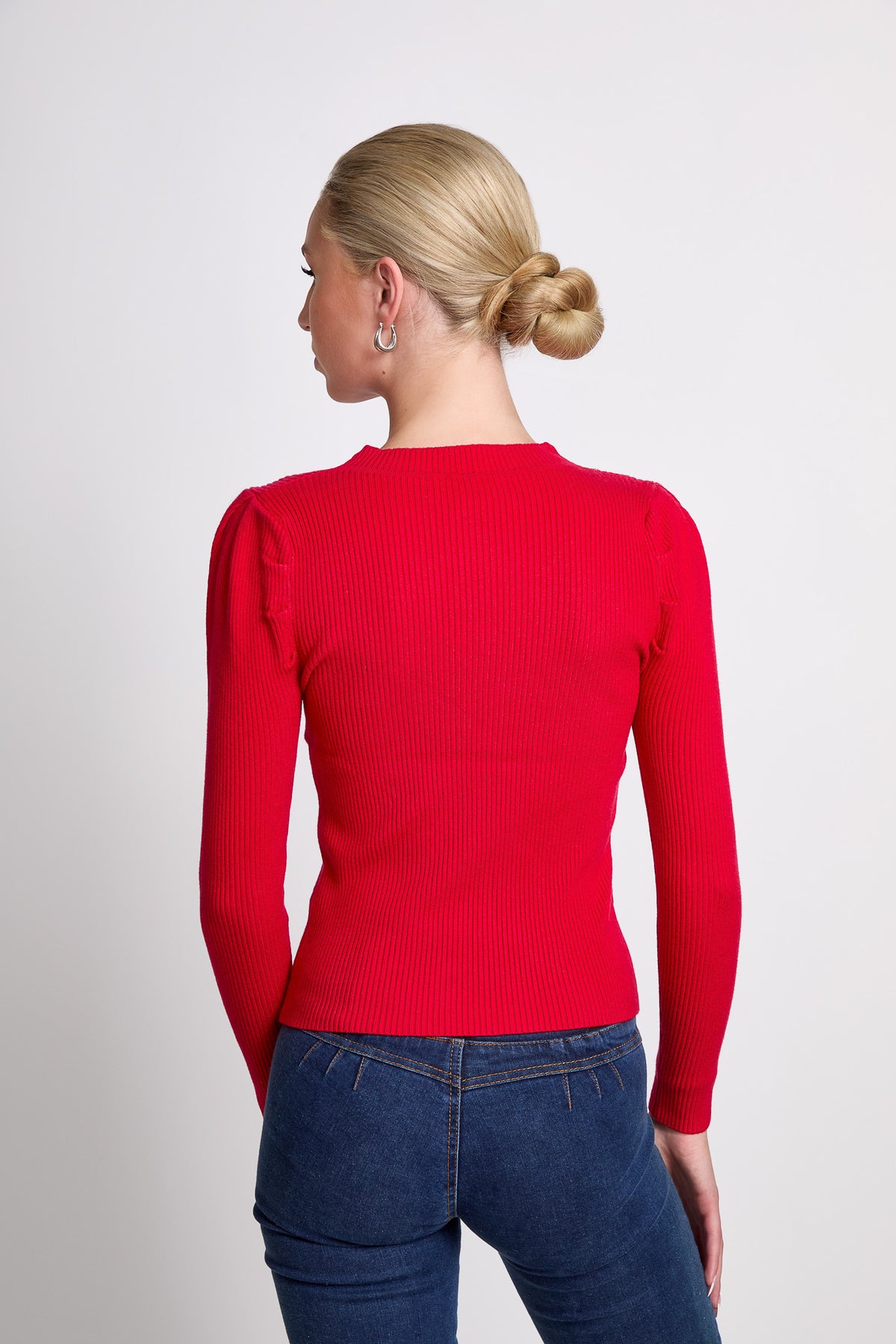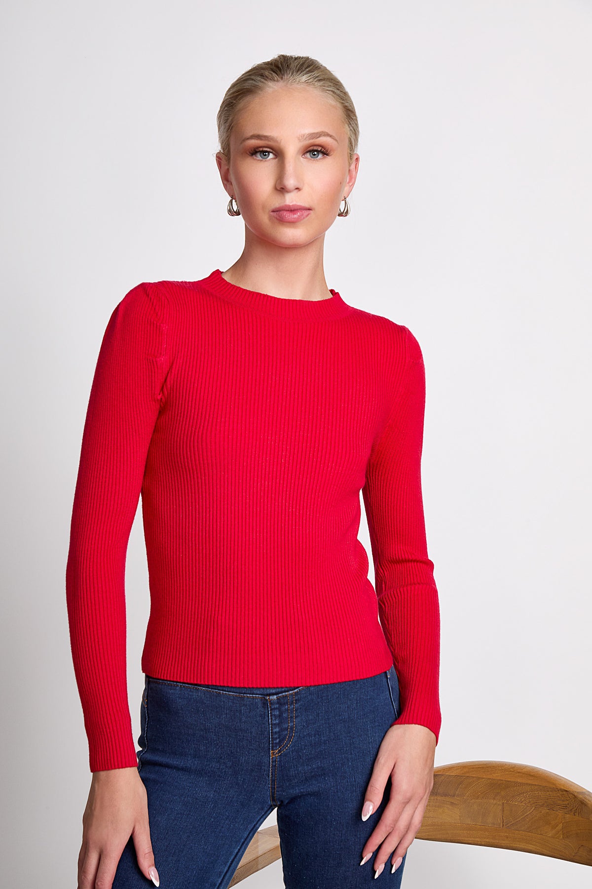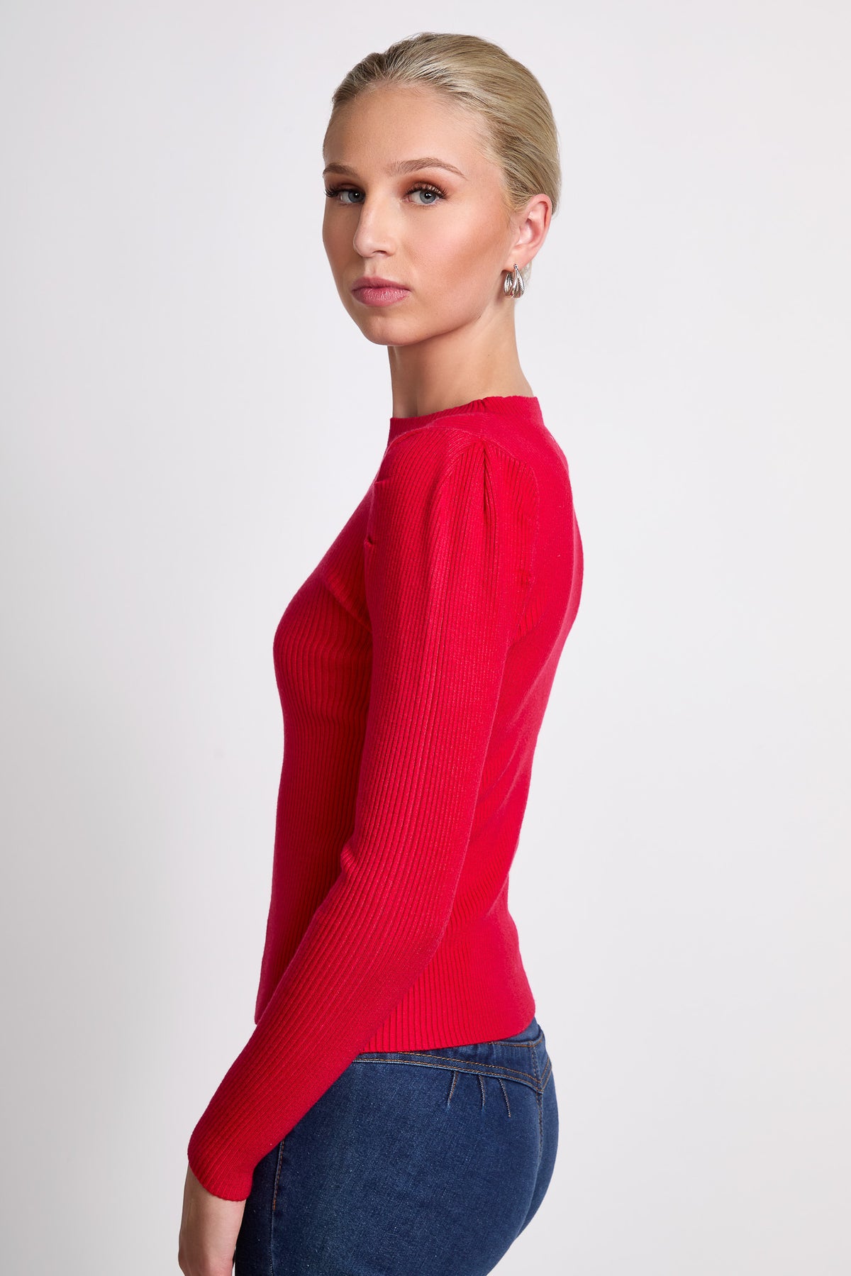 El tejido de canalé del jersey recorre toda la prenda, creando líneas verticales que alargan y definen la silueta. Una pieza esencial con sutiles fruncidos en los hombros que añaden un toque femenino y un acabado refinado.