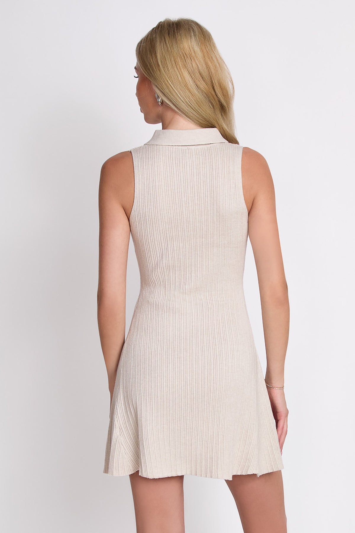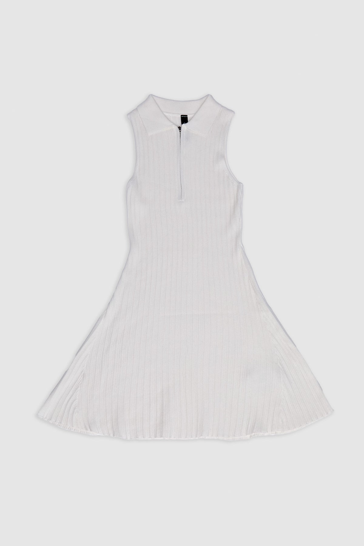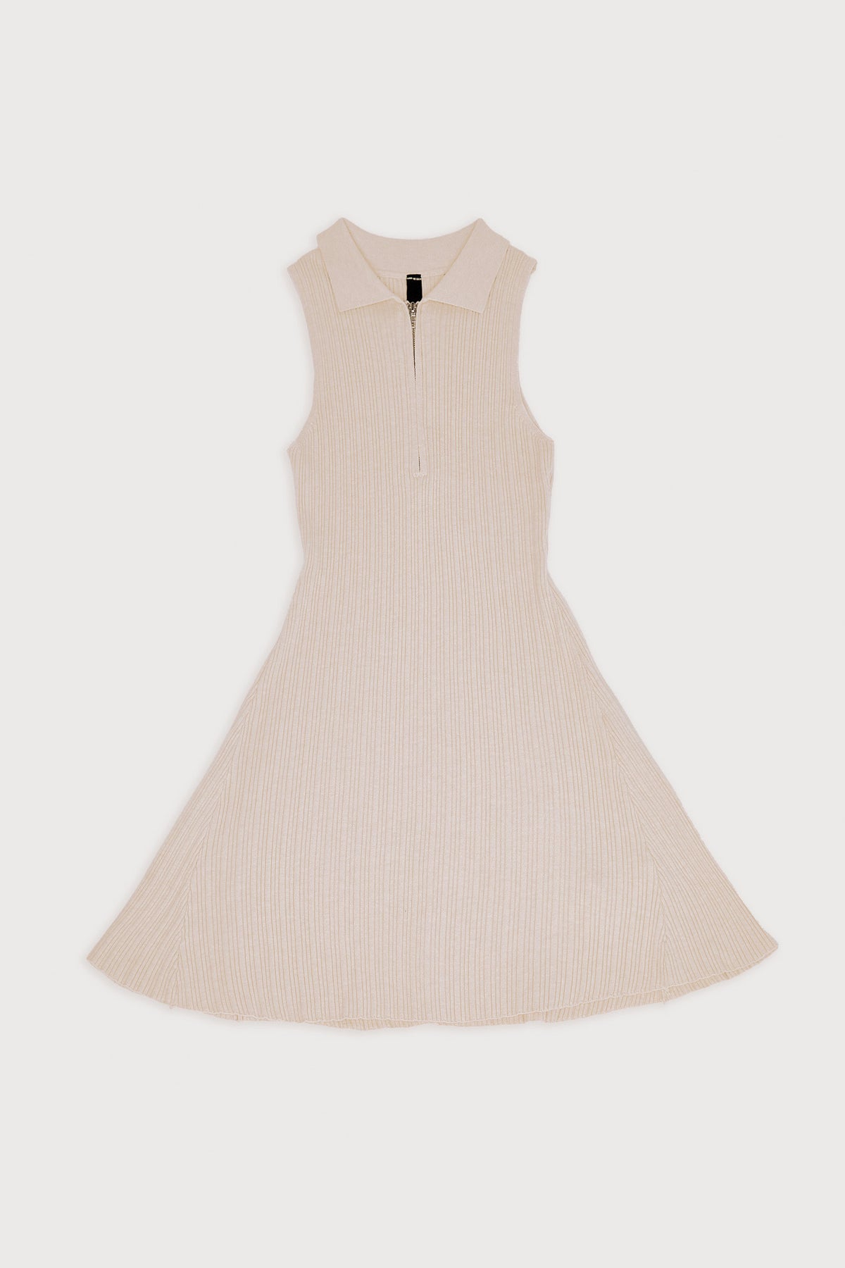 El punto acanalado confiere al vestido una textura refinada y ligera, aportando movimiento natural a su silueta. Su cuello tipo polo con cierre metálico introduce un guiño deportivo sutil, equilibrado con líneas limpias y femeninas. Una pieza versátil que se adapta con facilidad a un estilo casual sofisticado o a un look de transición elegante.