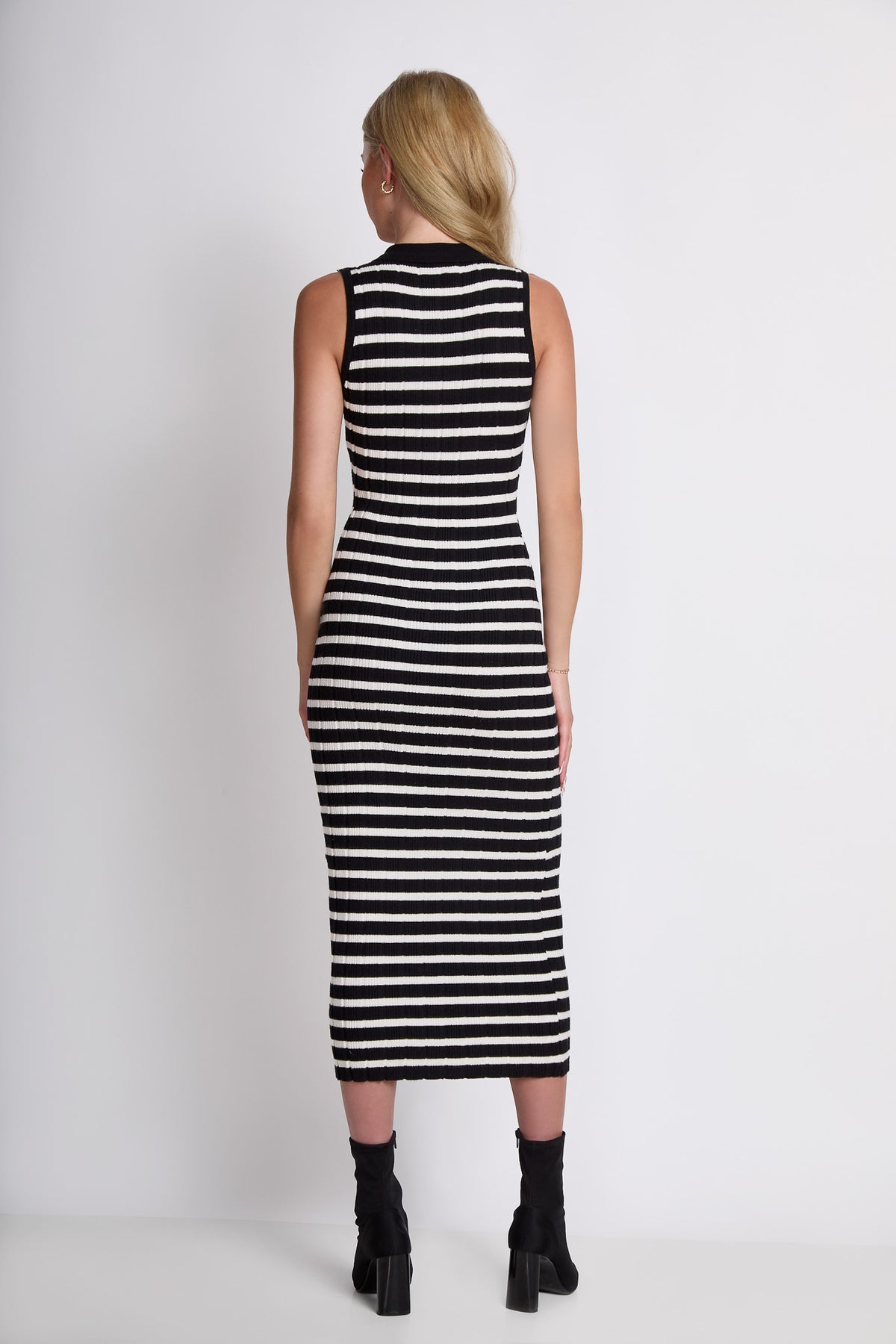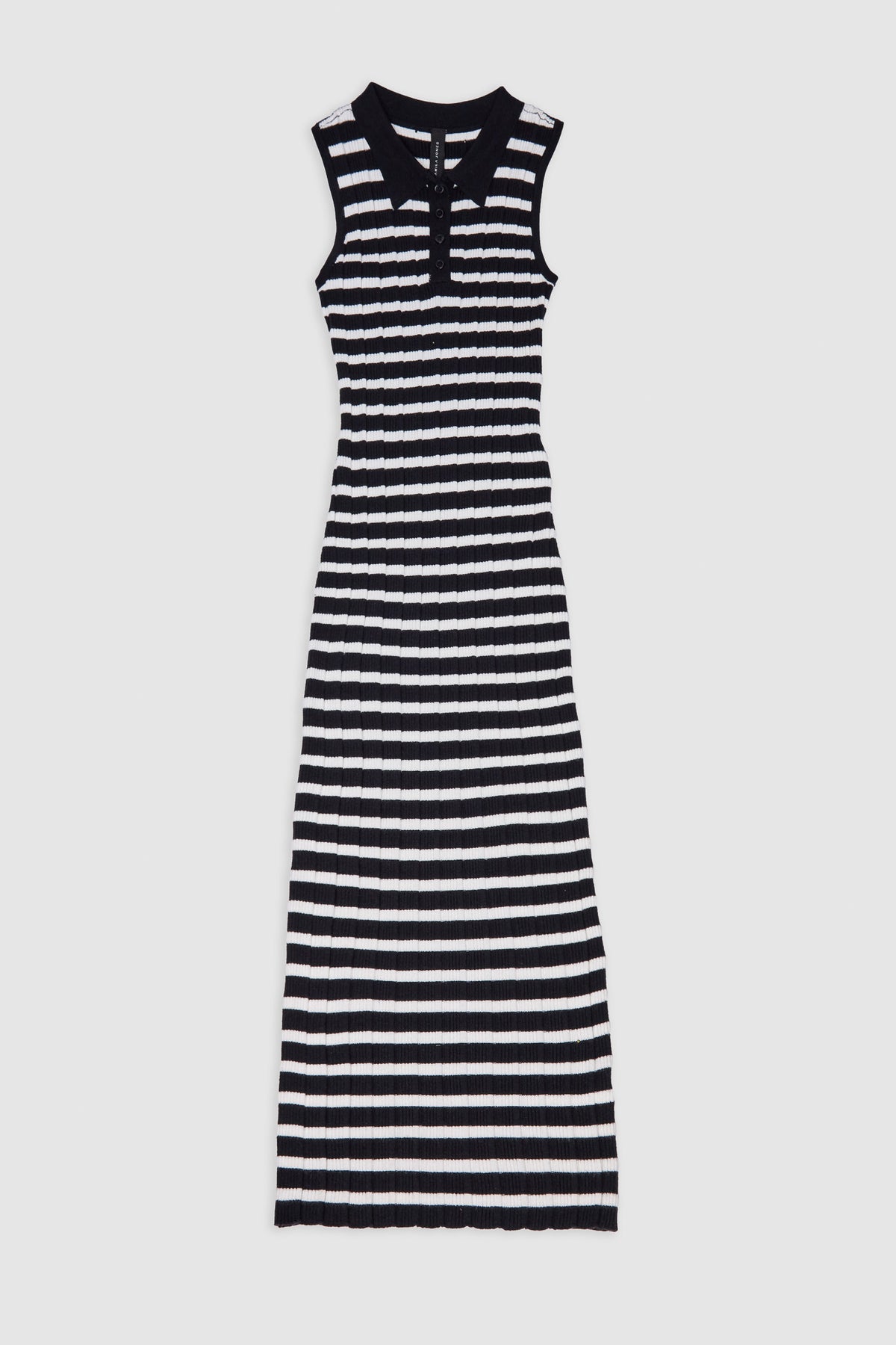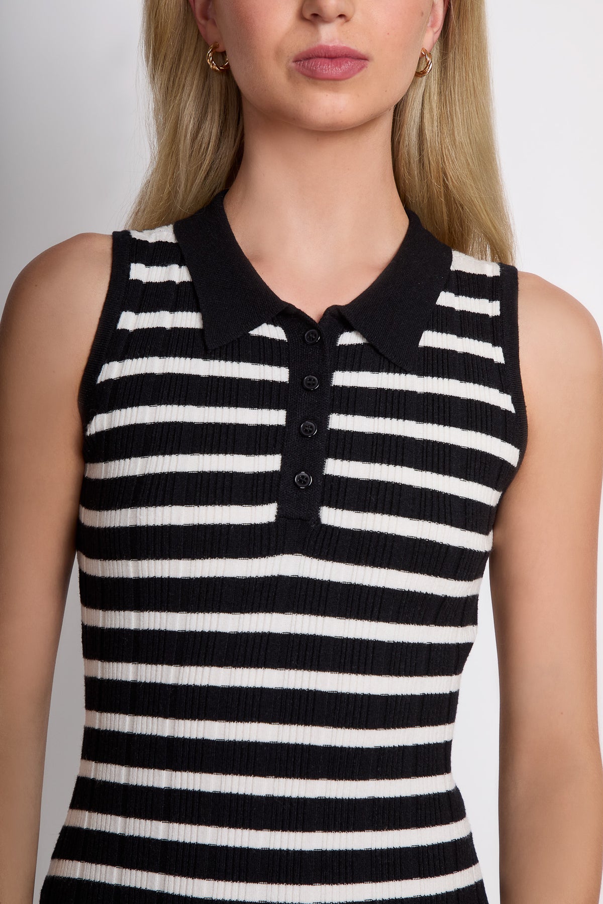 El vestido con rayas clásicas se reinterpretan en una silueta contemporánea sin mangas. El tejido acanalado aporta textura y definición, mientras que el cuello tipo polo con botones añade un guiño deportivo y pulido a la vez. Una pieza versátil que equilibra lo relajado y lo elegante con naturalidad.