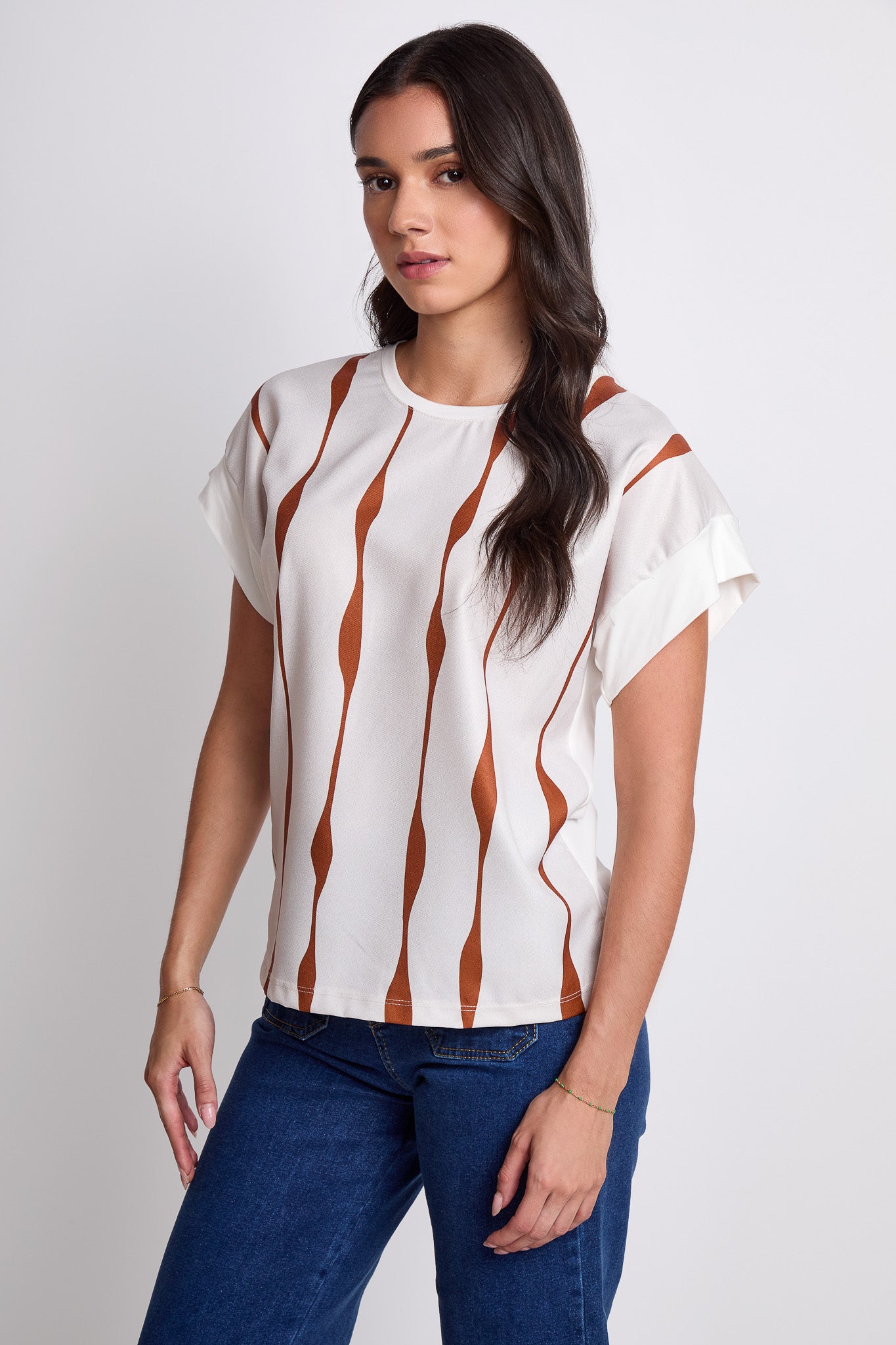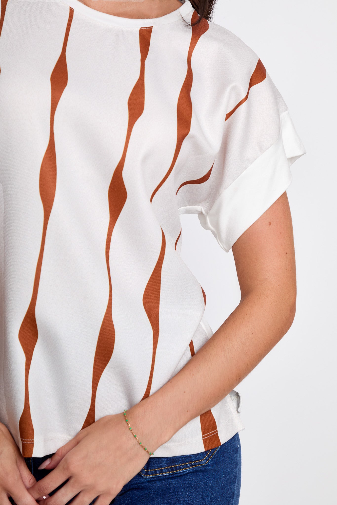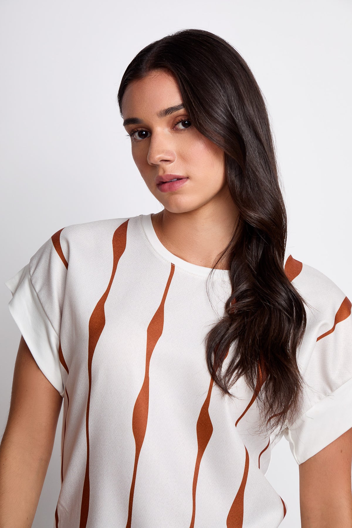 Blusa de viscosa ligera que aporta suavidad y caída fluida. Su diseño con líneas orgánicas sobre fondo crema y mangas amplias combina estructura y movimiento. Una pieza versátil, moderna y naturalmente elegante.