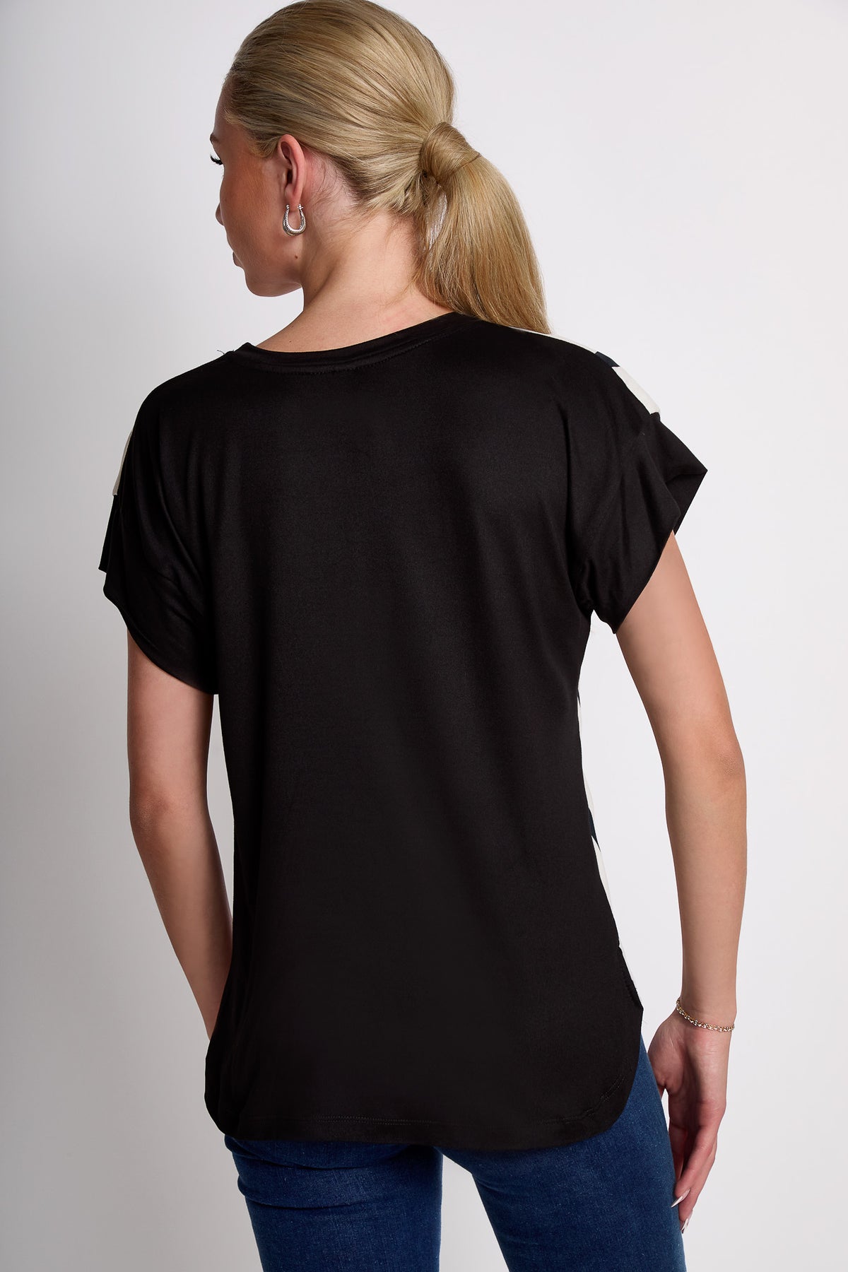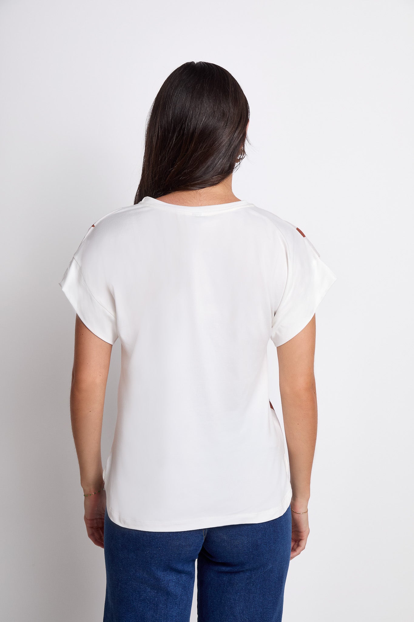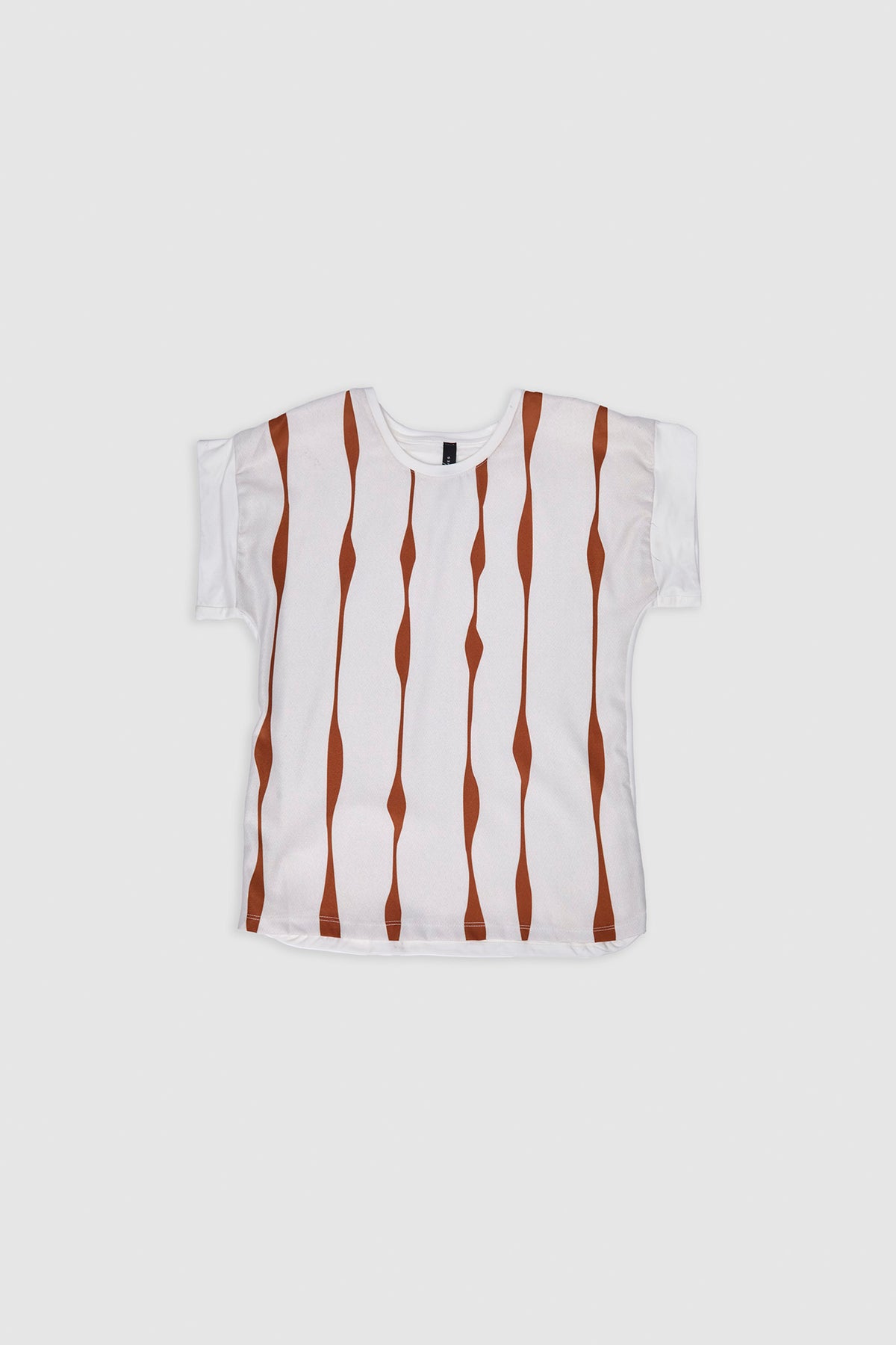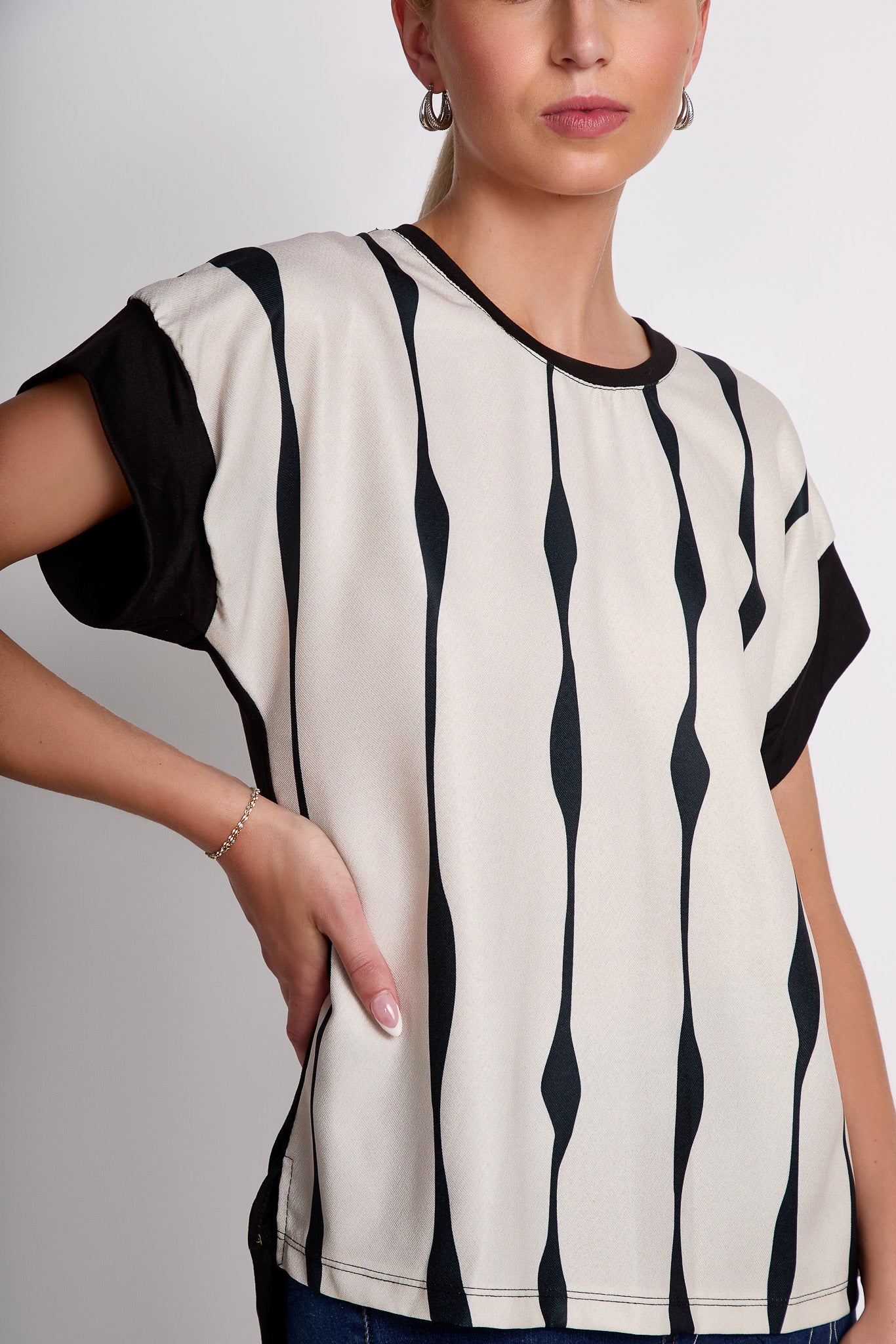 Blusa de viscosa ligera que aporta suavidad y caída fluida. Su diseño con líneas orgánicas sobre fondo crema y mangas amplias combina estructura y movimiento. Una pieza versátil, moderna y naturalmente elegante.