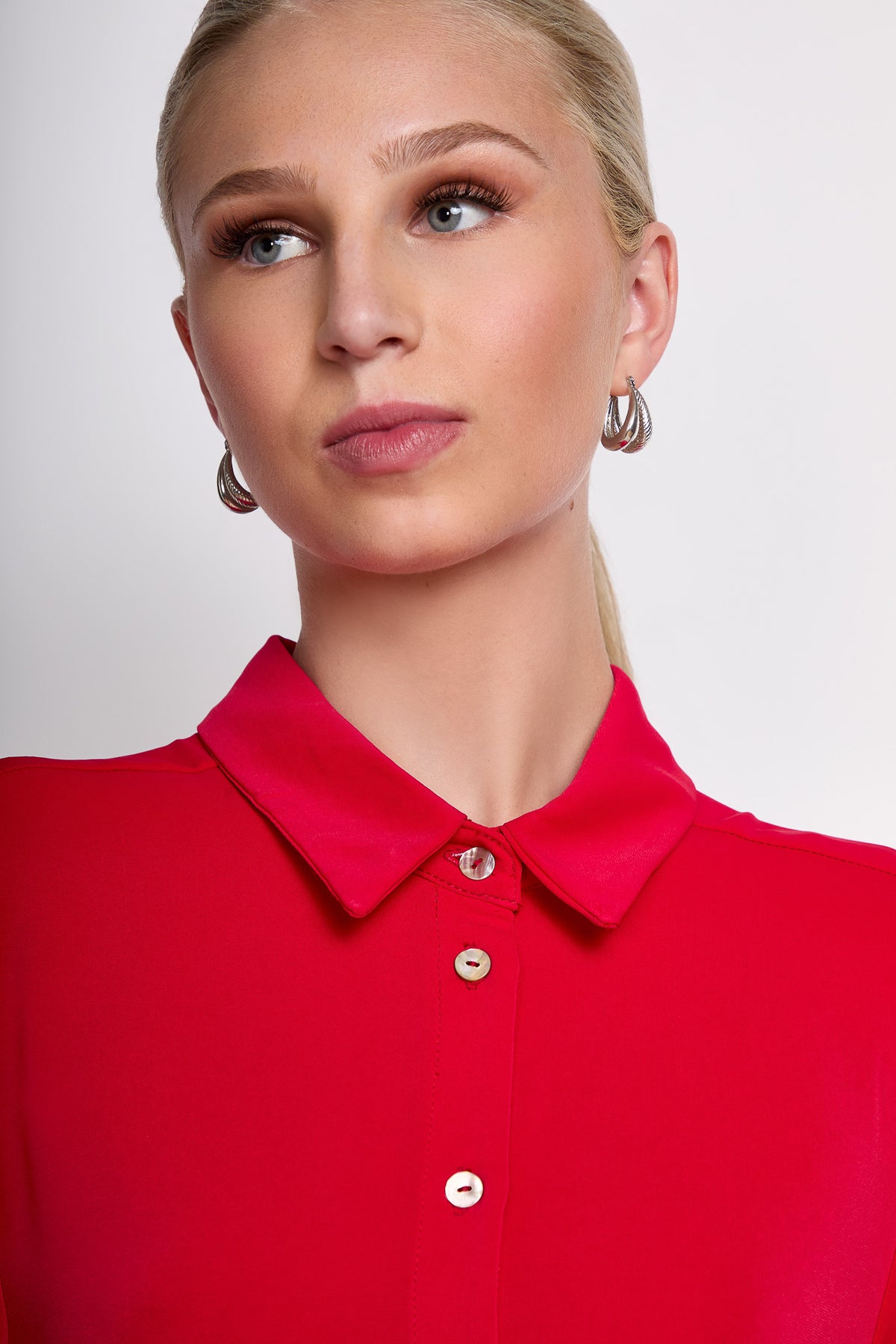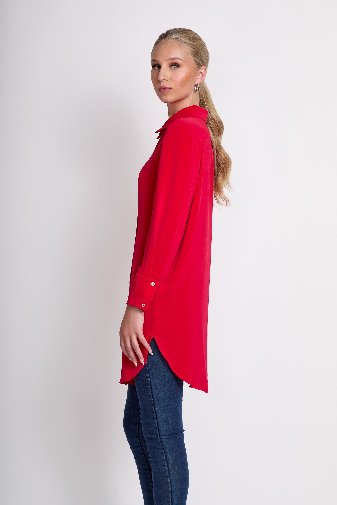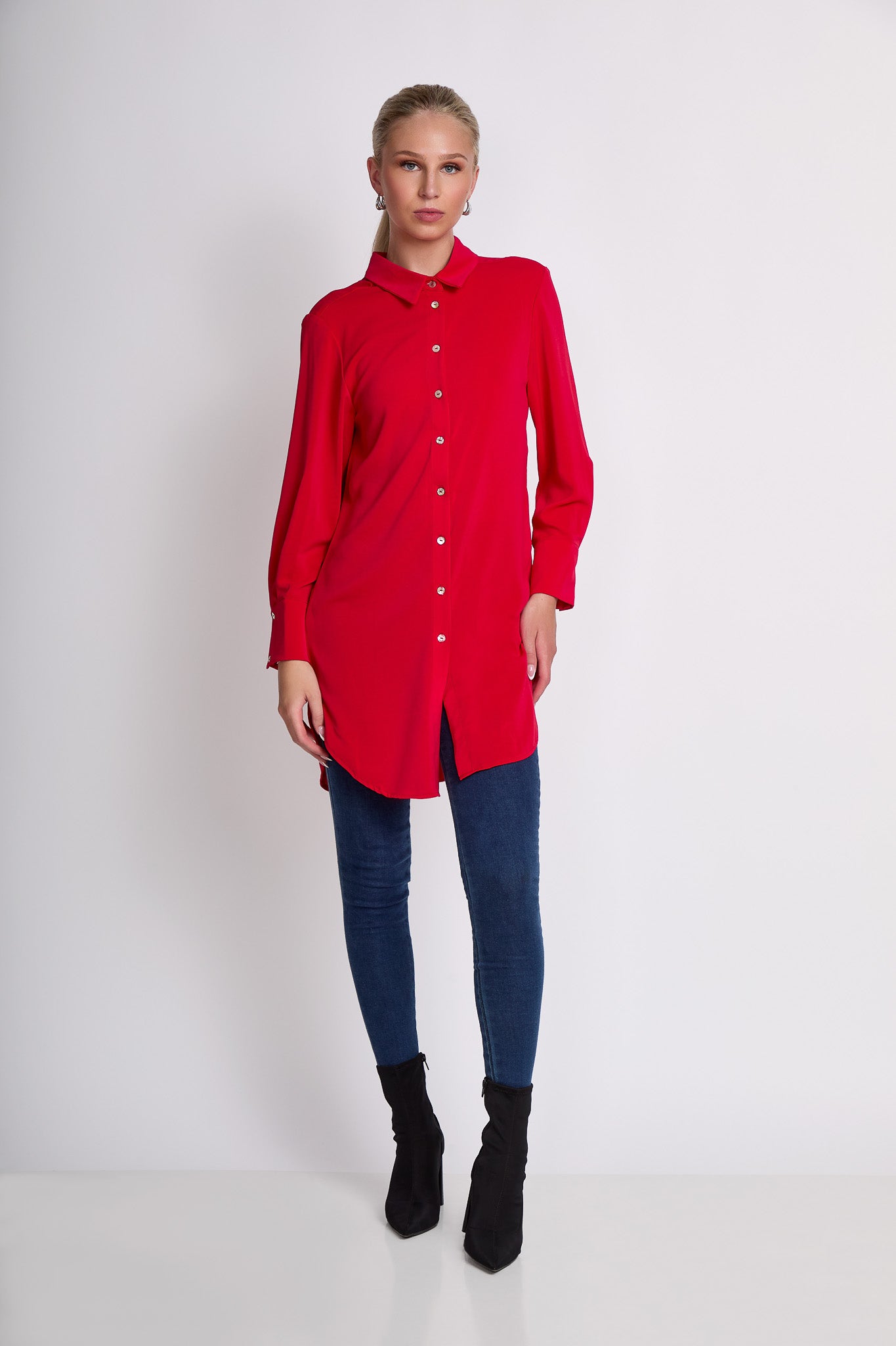 Camisa larga con botonadura completa y corte recto que estiliza la silueta. Su color rojo vibrante aporta energía y presencia, mientras el tejido ligero ofrece movimiento y comodidad con un toque de sofisticación atemporal.