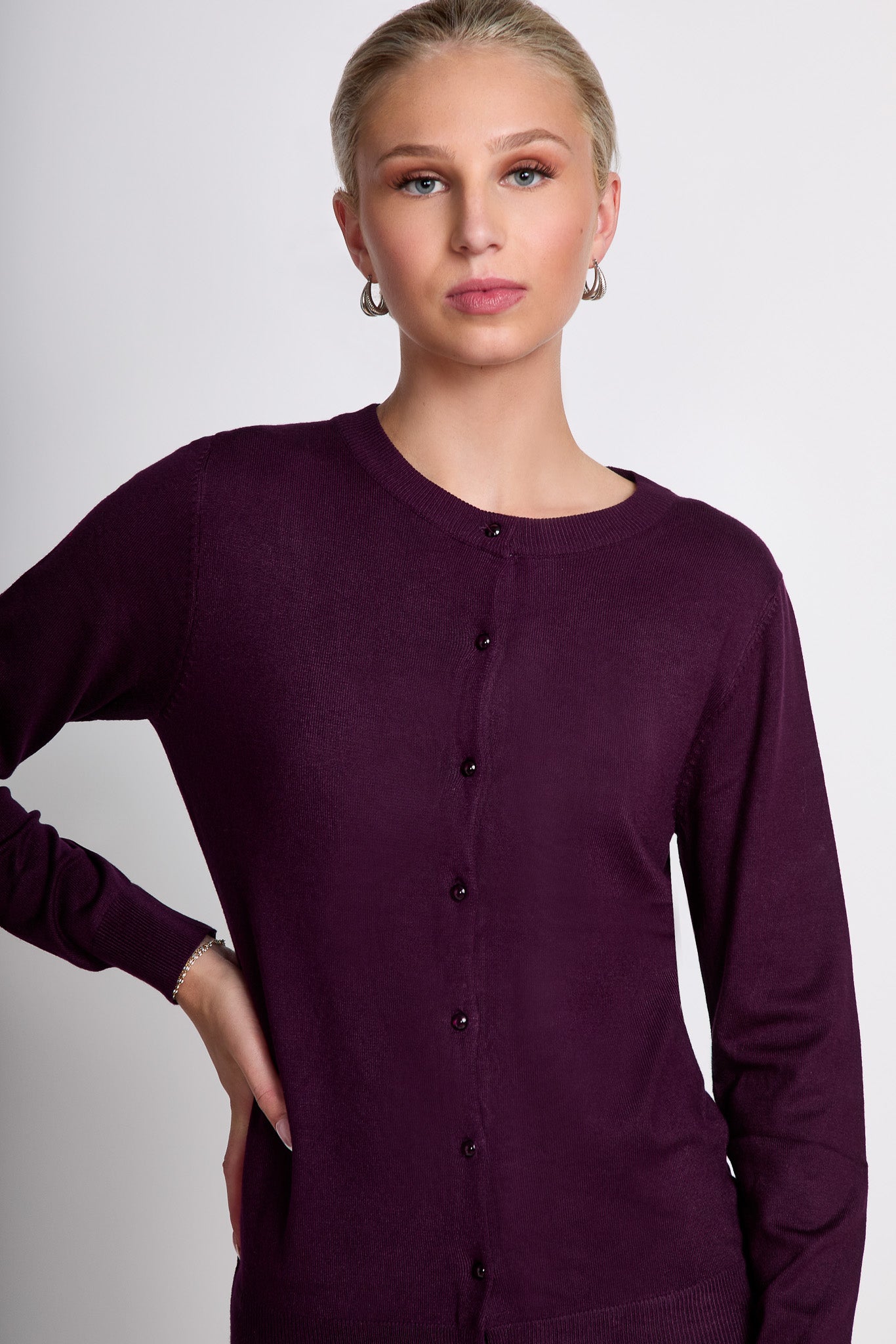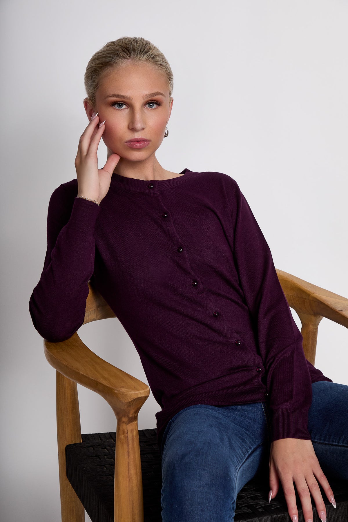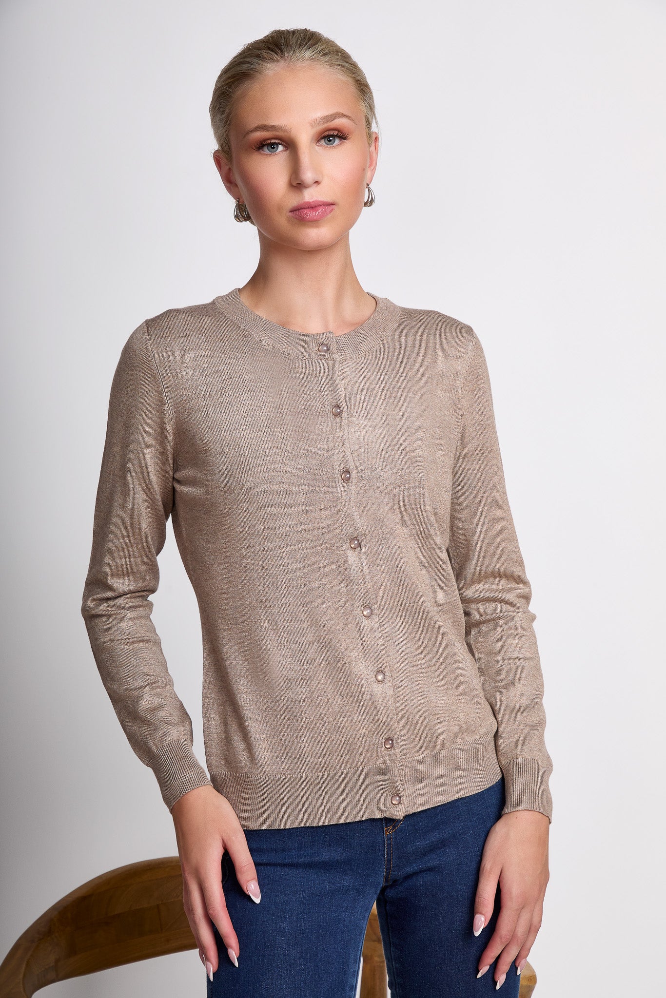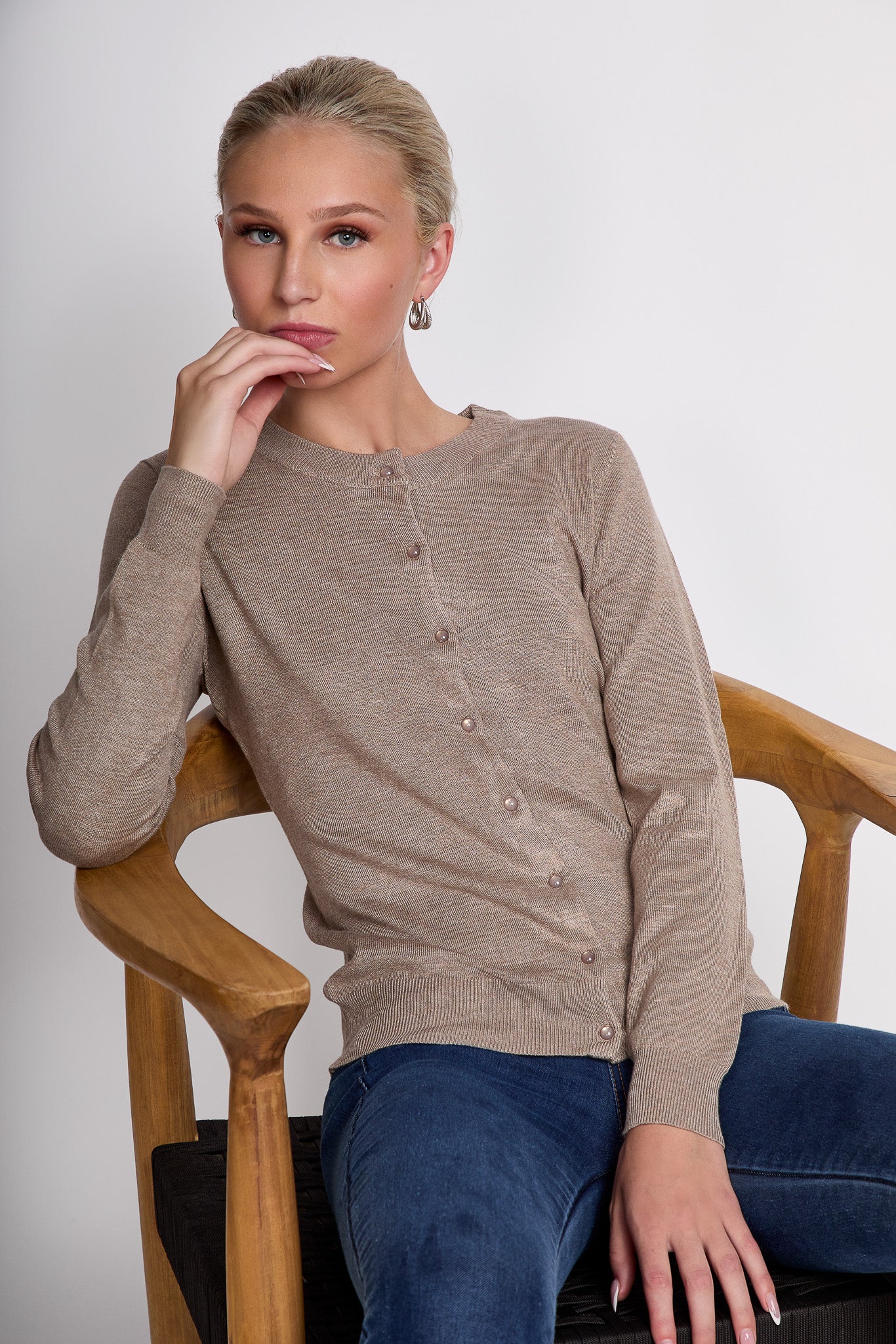 Cárdigan tejido, de textura suave y acabado ligero. Su diseño clásico con botones frontales y corte ajustado ofrece comodidad y sofisticación atemporal, ideal para capas versátiles de entretiempo.