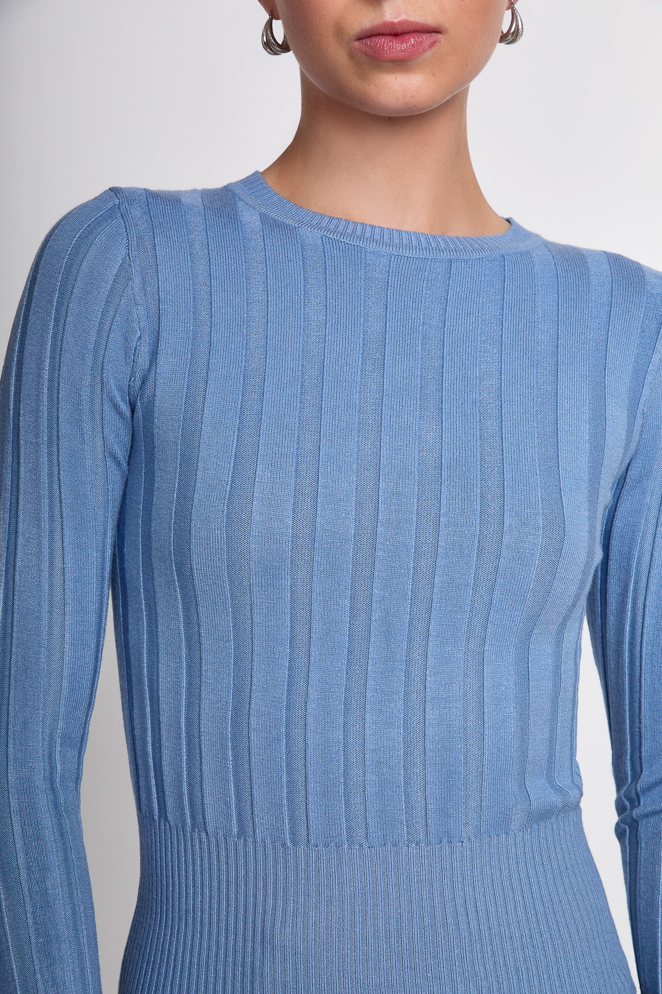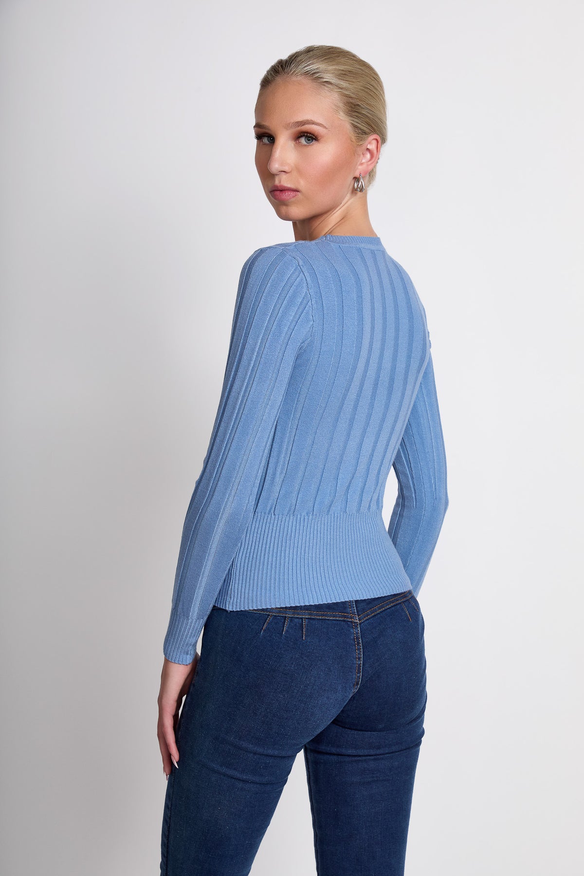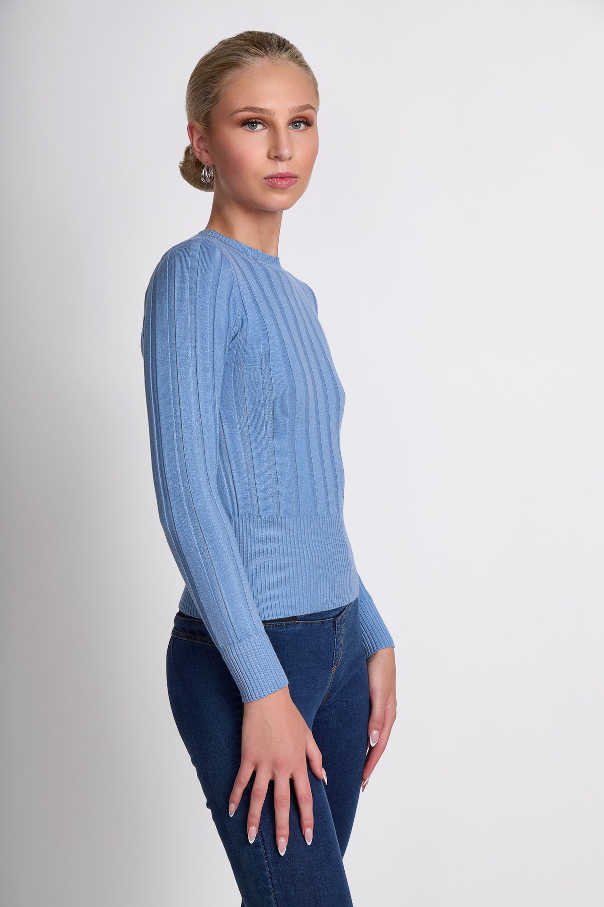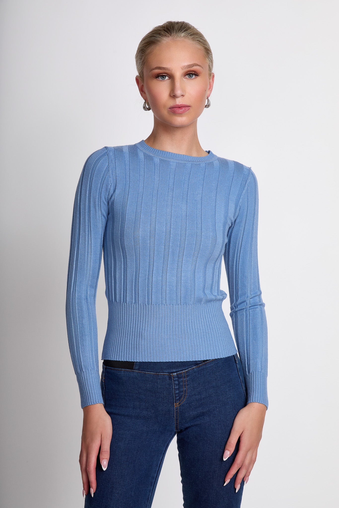 Suéter canalé, de ajuste ceñido y textura elástica que realza la figura. Su diseño clásico con cuello redondo combina comodidad, versatilidad y un aire refinado para el día a día.
